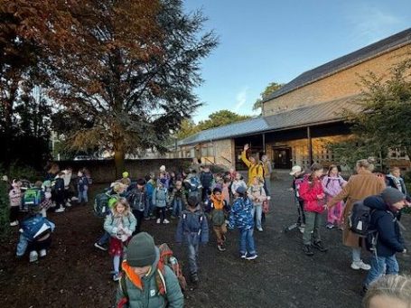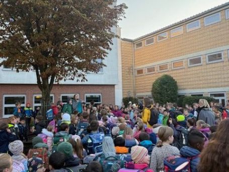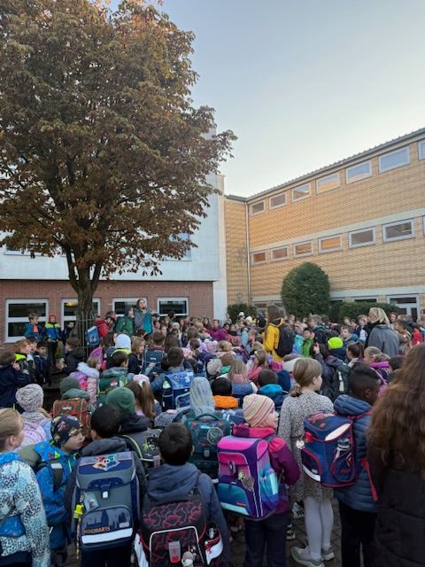 Am 26. September versammelten sich die Lehrkräfte und die Schülerinnen und Schüler für den Sternmarsch an vereinbarten Treffpunkten quer über den Heilsberg verteilt. Wir liefen in Form eines großen Sterns gemeinsam zur Schule.